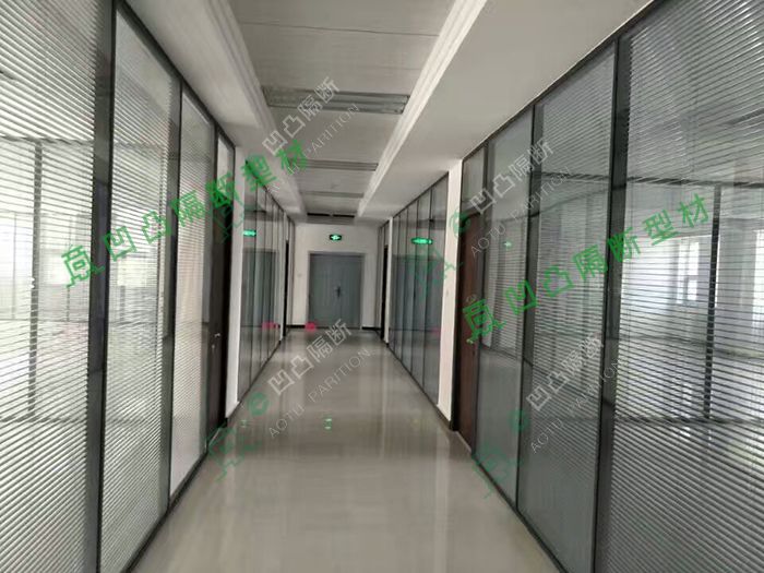 雙層玻璃隔斷:其基本結構是由雙層玻璃和鋁合金型材構成的隔斷墻體牢固耐久,整體感更強,且雙層玻璃中間加入各式百葉,可實現更多效果。