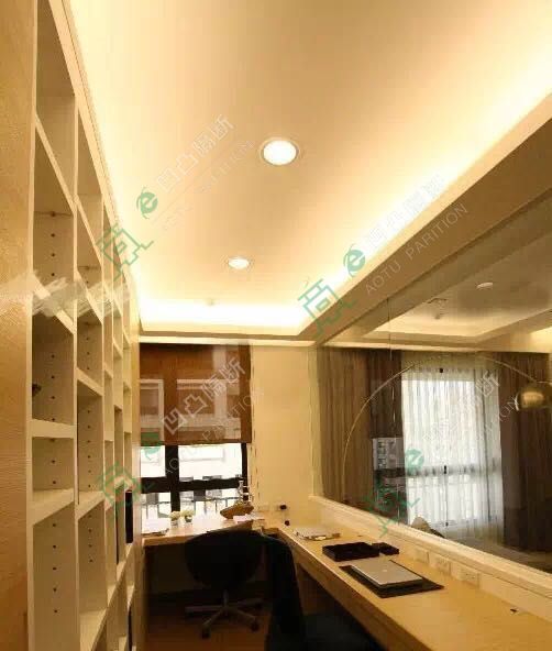 玻璃隔斷效果圖:整個書房空間與客廳之間采用了玻璃隔間,使之增添了整個書房空間的空間之感。