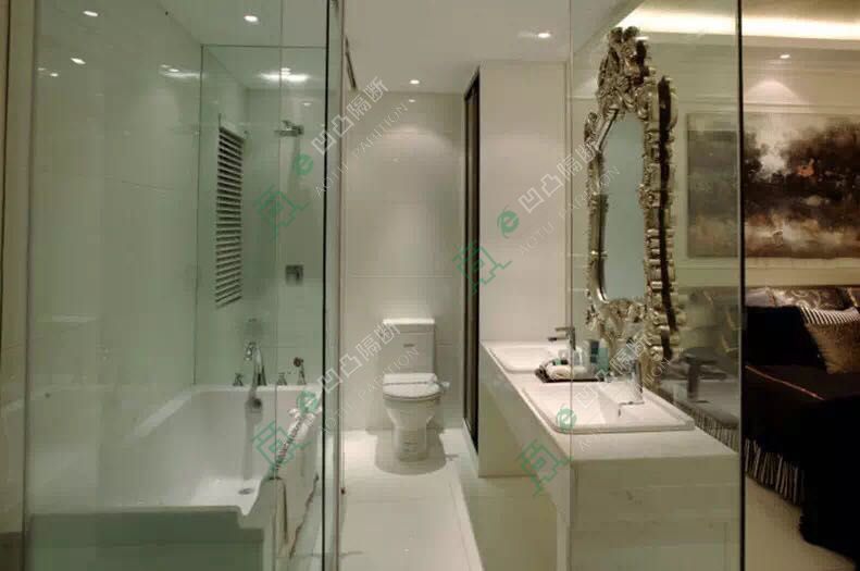 玻璃隔斷效果圖:這是一個主臥室衛生間,沒有過多的裝飾,玻璃材質的隔斷,配上白色的家具,使整個空間寧靜而又從容優雅。