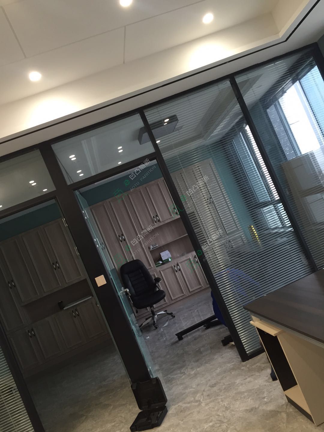 安徽凹凸隔斷裝飾工程有限公司承接安慶市龍騰裝飾有限公司新辦公室雙玻百葉玻璃隔斷工程